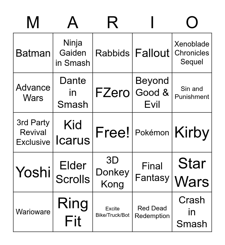 This bingo card has a free space and 90 words: Mario Kart, Mario Party, 3D Donkey Kong, Bayonetta, No More Heroes 3, Animal Crossing, Breath of the Wild 2, Zelda Port, Xenoblade Chronicles X, Metroid Prime 4, 2D Metroid, Punch-Out!, Mother, Kirby, Metroid Prime Trilogy, FZero, Star Fox, Project Triangle Strategy, Wii Sports, Shin Megami Tensei V, Mass Effect, Dark Souls, Excite Bike/Truck/Bot, New Third Party/Nintendo Crossover, 3rd Party Revival Exclusive, Ring Fit, Arms, Pikmin, Splatoon, Rune Factory, HALO, Star Wars, Resident Evil, Yoshi, Batman, Fallout, Rabbids, Ice climbers, Kid Icarus, Sin and Punishment, Warioware, Advance Wars, Fire Emblem, GTA, Persona, Final Fantasy, Diddy Kong Racing, Rhythm Heaven, 3D Mario, 2D Mario, Marvel, Beyond Good & Evil, Pro Evolution Soccer, Amiibo, Eternal Darkness, TimeSplitters, Pokémon, WarioLand, Nintendo Switch Online, EA Sports, The Sims, Dead Space, 2K Sports, Castlevania, Rare Replay, Bully, Okami 2, Red Dead Redemption, Bloodstained, Wolfenstein, Elder Scrolls, Crash in Smash, Zelda Character in Smash, Pokémon in Smash, Ninja Gaiden in Smash, Dante in Smash, Master Chief in Smash, Call of Duty, Battlefield, NintendoLand, Red Steel, Xenoblade Chronicles Sequel, New Monolith IP, Borderlands, Hyrule Warriors, Available Later Today, vs Capcom, 2D Donkey Kong, Super Mario RPG and Goldeneye.