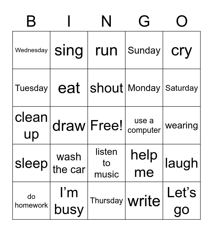 This bingo card has a free space and 32 words: write, talk, draw, read, sleep, eat, cry, laugh, sing, walk, shout, run, exercise, have a snack, use a computer, watch movies, do homework, clean up, listen to music, wash the car, help me, look, wearing, I’m busy, Let’s go, Sunday, Monday, Tuesday, Wednesday, Thursday, Friday and Saturday.