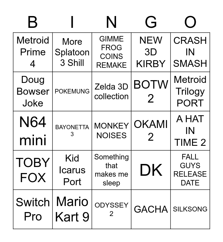 This bingo card has a free space and 24 words: Kid Icarus Port, Mario Kart 9, Zelda 3D collection, Switch Pro, CRASH IN SMASH, Metroid Prime 4, Doug Bowser Joke, More Splatoon 3 Shill, OKAMI 2, Something that makes me sleep, BOTW 2, N64 mini, DK, FALL GUYS RELEASE DATE, POKEMUNG, GACHA, A HAT IN TIME 2, GIMME FROG COINS REMAKE, Metroid Trilogy PORT, BAYONETTA 3, SILKSONG, TOBY FOX, NEW 3D KIRBY and ODYSSEY 2.