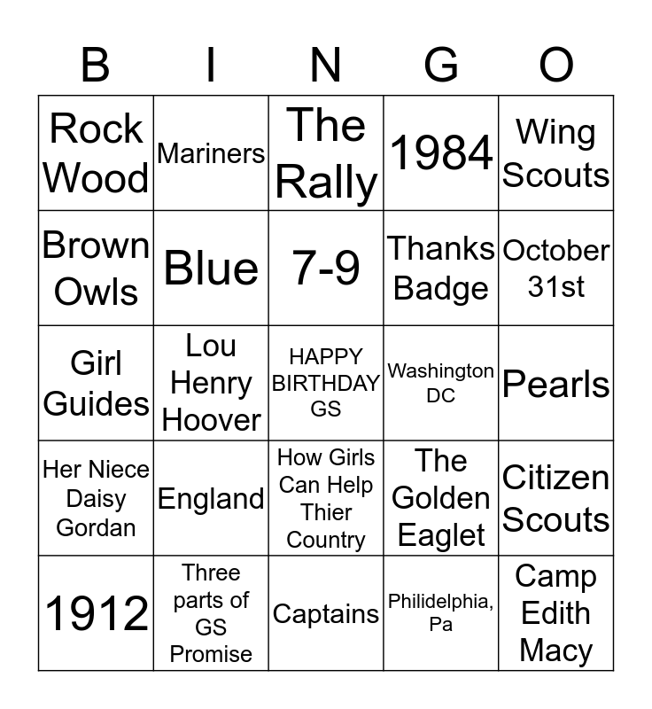 This bingo card has a free space and 24 words: England, Three parts of GS Promise, 7-9, 1912, Wing Scouts, Rock Wood, Brown Owls, Mariners, Washington DC, How Girls Can Help Thier Country, Thanks Badge, Girl Guides, The Golden Eaglet, Citizen Scouts, Blue, Philidelphia, Pa, Pearls, The Rally, October 31st, Lou Henry Hoover, Camp Edith Macy, Her Niece Daisy Gordan, 1984 and Captains.
