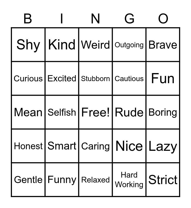 This bingo card has a free space and 24 words: Smart, Funny, Stubborn, Gentle, Brave, Shy, Curious, Kind, Rude, Caring, Cautious, Mean, Nice, Lazy, Excited, Hard Working, Boring, Weird, Fun, Selfish, Strict, Honest, Outgoing and Relaxed.