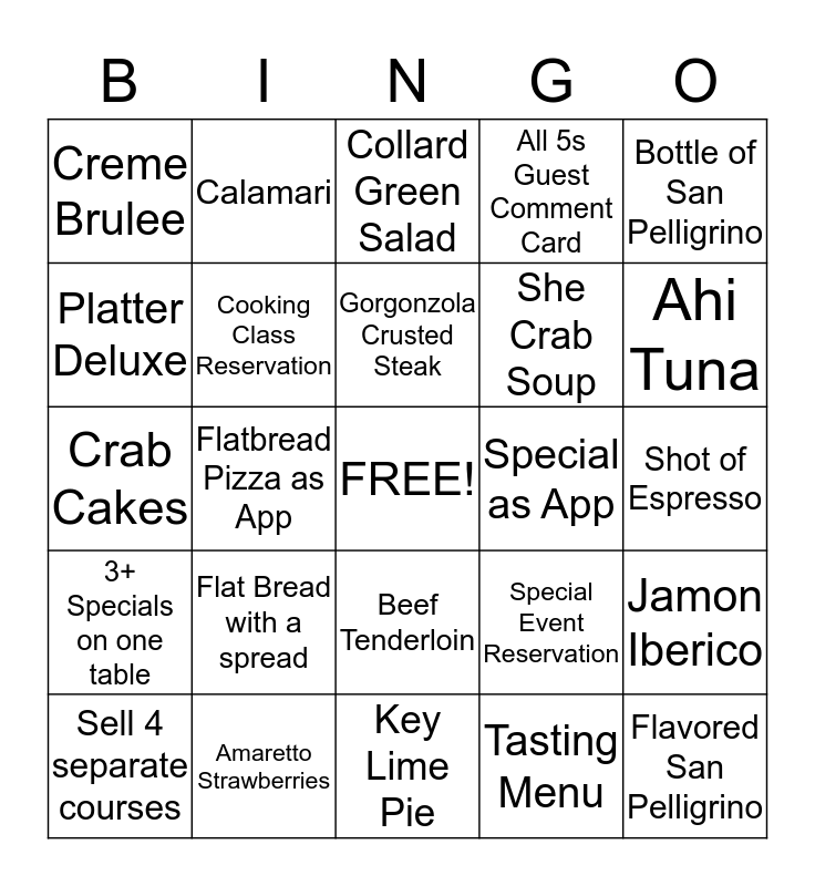 This bingo card has a free space and 24 words: Flat Bread with a spread, Amaretto Strawberries, Gorgonzola Crusted Steak, Sell 4 separate courses, Bottle of San Pelligrino, Creme Brulee, Platter Deluxe, Calamari, Special as App, Beef Tenderloin, She Crab Soup, Crab Cakes, Special Event Reservation, Jamon Iberico, Cooking Class Reservation, Tasting Menu, Shot of Espresso, Collard Green Salad, Ahi Tuna, Flatbread Pizza as App, Flavored San Pelligrino, 3+ Specials on one table, All 5s Guest Comment Card and Key Lime Pie.