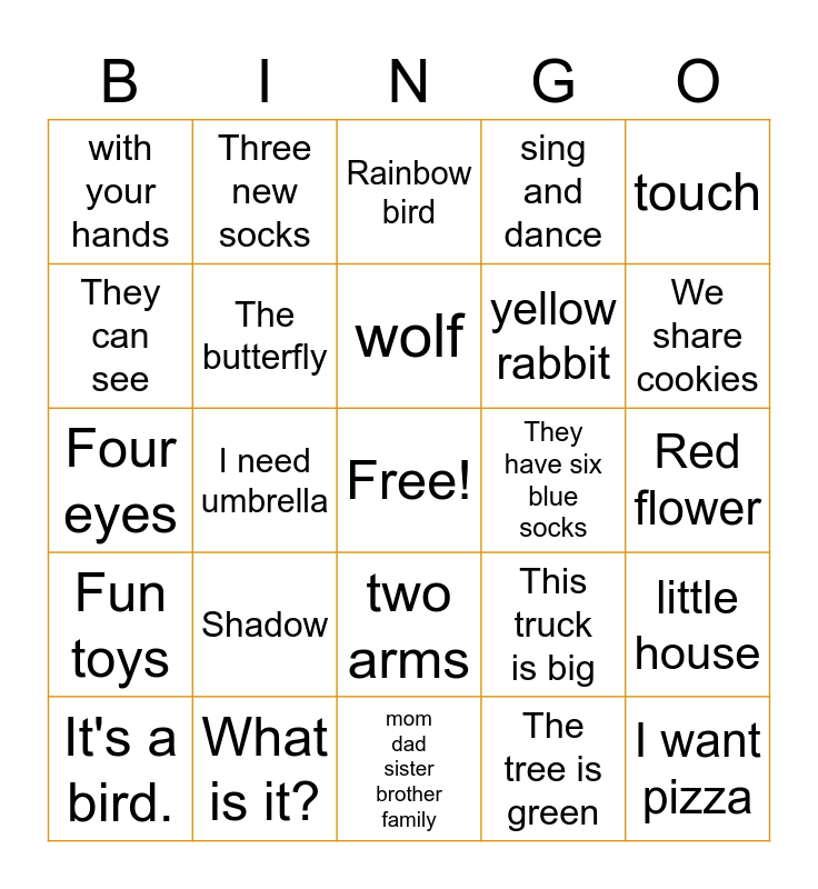 This bingo card has a free space and 24 words: Shadow, What is it?, wolf, It's a bird., touch, with your hands, They can see, Three new socks, They have six blue socks, two arms, yellow rabbit, Four eyes, This truck is big, little house, The butterfly, The tree is green, Red flower, Rainbow bird, We share cookies, I need umbrella, I want pizza, Fun toys, sing and dance and mom dad sister brother family.