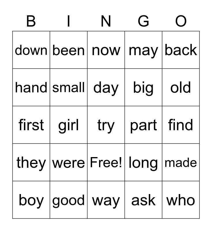 This bingo card has 26 words: Free!, ask, day, good, back, down, hand, been, find, long, big, first, made, boy, girl, man, may, they, now, try, old, way, part, were, small and who.