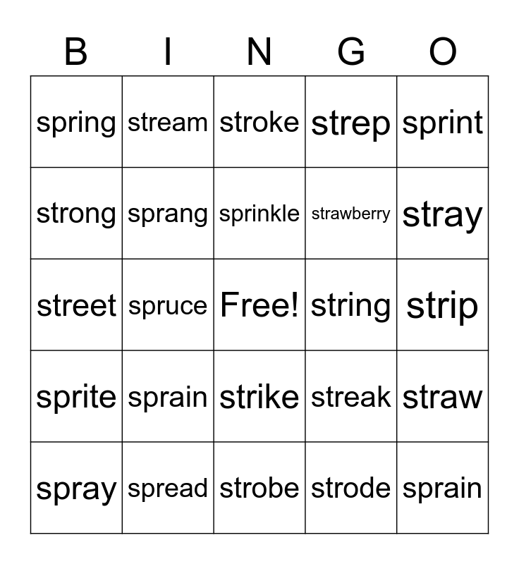 This bingo card has a free space and 24 words: sprain, spread, sprinkle, spray, sprint, spring, strong, stream, string, strike, strawberry, street, streak, straw, sprang, strode, strip, stroke, stray, spruce, sprain, sprite, strep and strobe.
