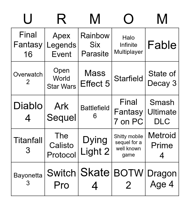This bingo card has a free space and 24 words: Bayonetta 3, The Calisto Protocol, Mass Effect 5, BOTW 2, Fable, Final Fantasy 16, Apex Legends Event, Rainbow Six Parasite, Final Fantasy 7 on PC, Smash Ultimate DLC, Diablo 4, Open World Star Wars, Shitty mobile sequel for a well known game, Metroid Prime 4, Overwatch 2, Switch Pro, Skate 4, Halo Infinite Multiplayer, State of Decay 3, Titanfall 3, Ark Sequel, Dying Light 2, Starfield and Dragon Age 4.