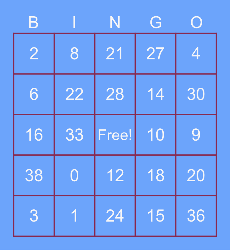 This bingo card has a free space and 24 words: 0, 1, 28, 3, 4, 2, 6, 8, 10, 12, 14, 16, 18, 20, 22, 15, 9, 21, 30, 33, 36, 38, 27 and 24.