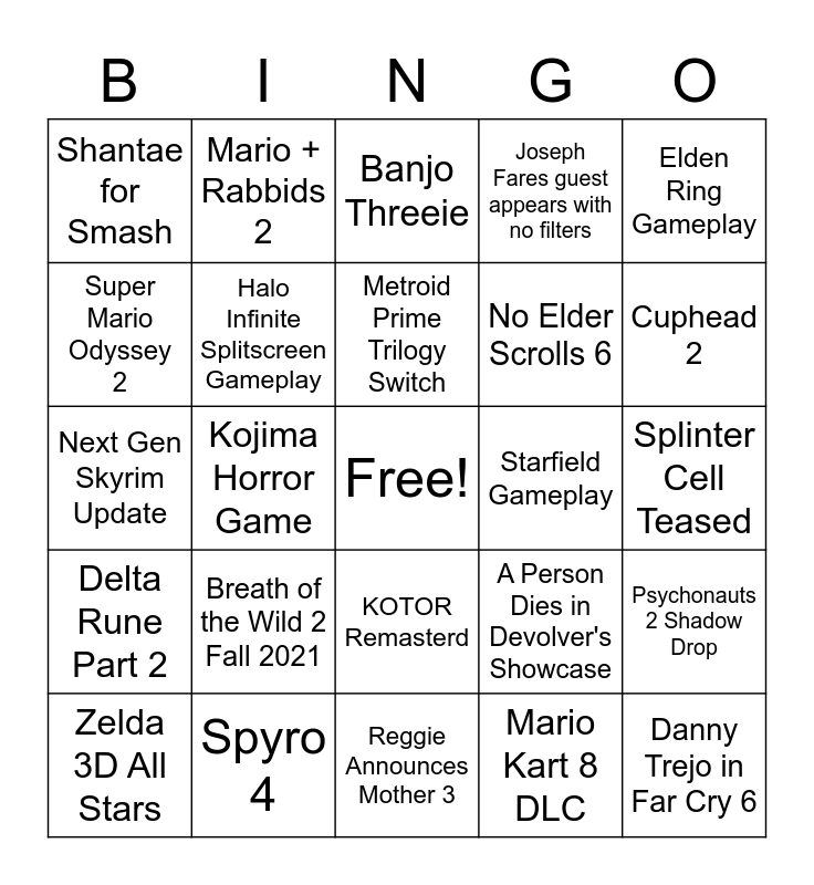 This bingo card has a free space and 24 words: Breath of the Wild 2 Fall 2021, Spyro 4, Metroid Prime Trilogy Switch, Zelda 3D All Stars, Elden Ring Gameplay, Shantae for Smash, Super Mario Odyssey 2, Mario + Rabbids 2, Starfield Gameplay, KOTOR Remasterd, No Elder Scrolls 6, Next Gen Skyrim Update, A Person Dies in Devolver's Showcase, Psychonauts 2 Shadow Drop, Halo Infinite Splitscreen Gameplay, Mario Kart 8 DLC, Splinter Cell Teased, Banjo Threeie, Cuphead 2, Kojima Horror Game, Danny Trejo in Far Cry 6, Delta Rune Part 2, Joseph Fares guest appears with no filters and Reggie Announces Mother 3.