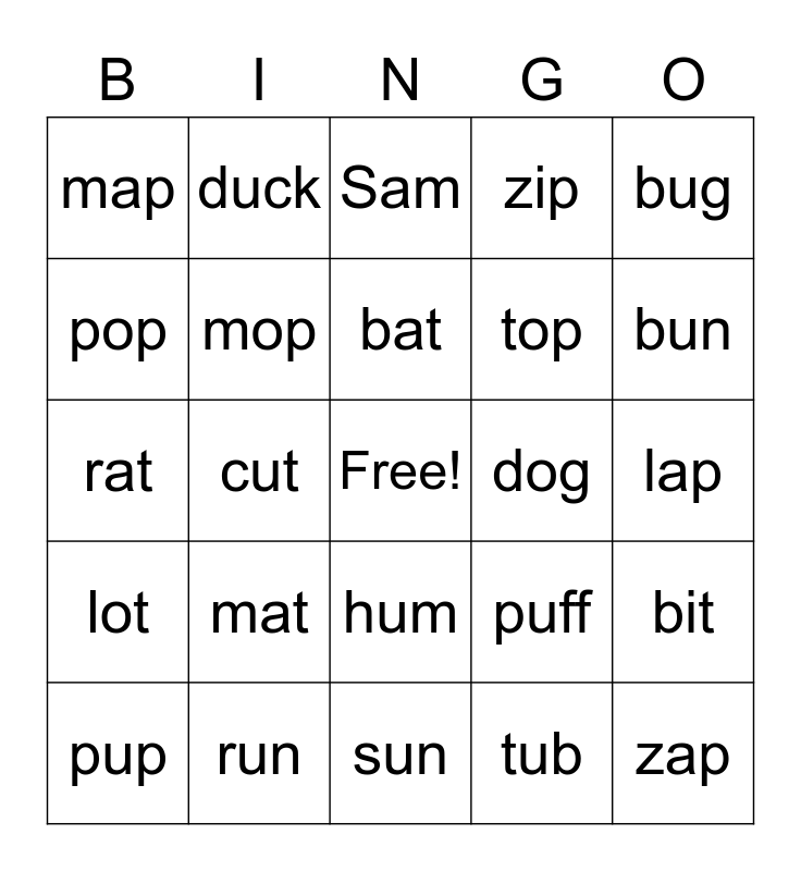 This bingo card has a free space and 33 words: cat, sat, cut, log, lot, mop, bug, pup, duck, luck, bat, Sam, the, have, dog, bun, run, rat, mat, puff, hum, hat, map, lap, sun, zap, zip, top, pop, bit, big, tub and pad.