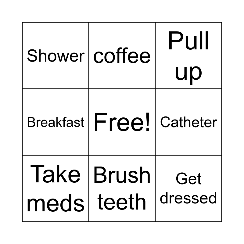 This bingo card has a free space and 8 words: Catheter, Pull up, coffee, Take meds, Shower, Get dressed, Breakfast and Brush teeth.