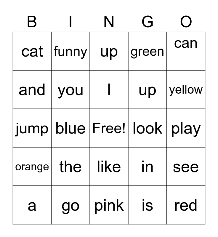 This bingo card has a free space and 24 words: the, go, I, a, can, cat, and, funny, look, like, up, jump, in, see, you, is, play, up, yellow, blue, red, orange, green and pink.