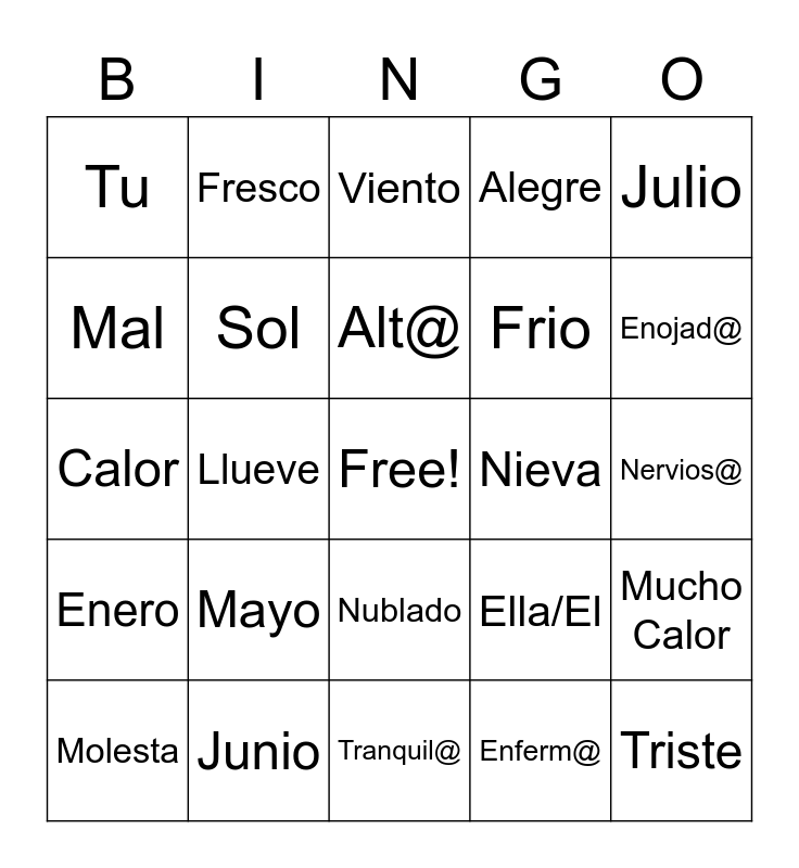 This bingo card has a free space and 30 words: Junio, El tiempo, Llueve, Nosotros, Tu, Viento, Sol, Nublado, Nieva, Tranquil@, Nervios@, Triste, Enferm@, Baj@, Enojad@, Bonit@, Ella/El, Enero, Mayo, Julio, Calor, Febrero, Fresco, Frio, Mal, Alegre, Mucho Calor, Molesta, Alt@ and Pequen@.