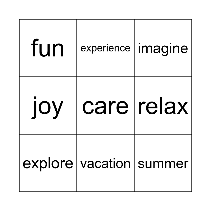 This bingo card has a free space and 11 words: adventure, vacation, summer, explore, experience, imagine, relax, love, joy, fun and treasure.