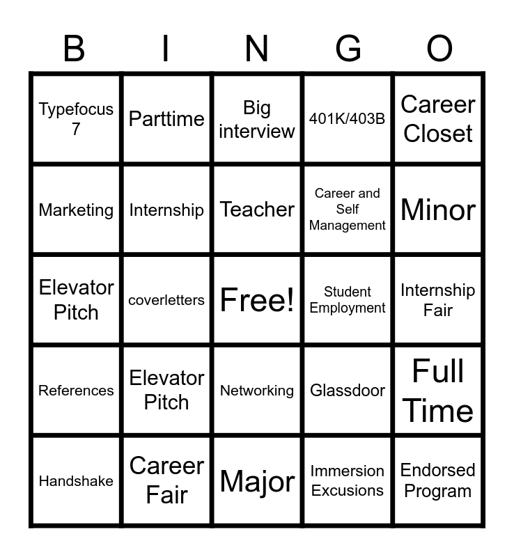 This bingo card has a free space and 29 words: Handshake, Resumes, coverletters, Kettler 109, Typefocus 7, Big interview, Internship, Elevator Pitch, Student Employment, Career Fair, Internship Fair, Endorsed Program, Major, Immersion Excusions, Minor, LinkedIn, Networking, References, Career Closet, Elevator Pitch, Glassdoor, Leadership, Career and Self Management, Marketing, 401K/403B, Parttime, Full Time, Teacher and English.