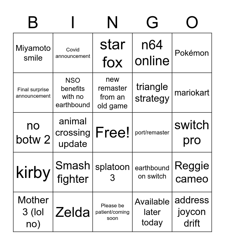 This bingo card has a free space and 24 words: Smash fighter, Zelda, new remaster from an old game, Mother 3 (lol no), Pokémon, Miyamoto smile, Final surprise announcement, Covid announcement, port/remaster, splatoon 3, triangle strategy, no botw 2, earthbound on switch, Reggie cameo, NSO benefits with no earthbound, Available later today, switch pro, star fox, mariokart, animal crossing update, address joycon drift, kirby, n64 online and Please be patient/coming soon.