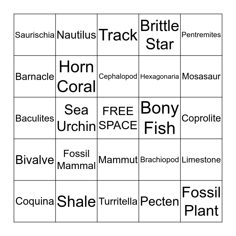 This bingo card has a free space and 36 words: Cnidaria, Eurypterid, Trilobite, Horn Coral, Brachiopod, Bivalve, Cephalopod, Gastropod, Pentremites, Crinoid, Sea Urchin, Brittle Star, Shark, Bony Fish, Mosasaur, Saurischia, Ornithischia, Fossil Mammal, Fossil Plant, Track, Coprolite, Limestone, Shale, Coquina, Turritella, Nautilus, Baculites, Worthenia, Hexagonaria, Barnacle, Fossil Insect, Gryphaea, Pecten, Mammut, Mammuthus and Amber.