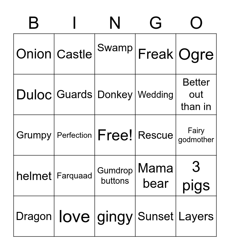 This bingo card has a free space and 25 words: Farquaad, gingy, Donkey, Dragon, Ogre, Onion, Duloc, Castle, Rescue, Gumdrop buttons, Wedding, Grumpy, Mama bear, 3 pigs, Guards, Noble steed, Fairy godmother, Swamp, Better out than in, Perfection, Layers, love, helmet, Freak and Sunset.