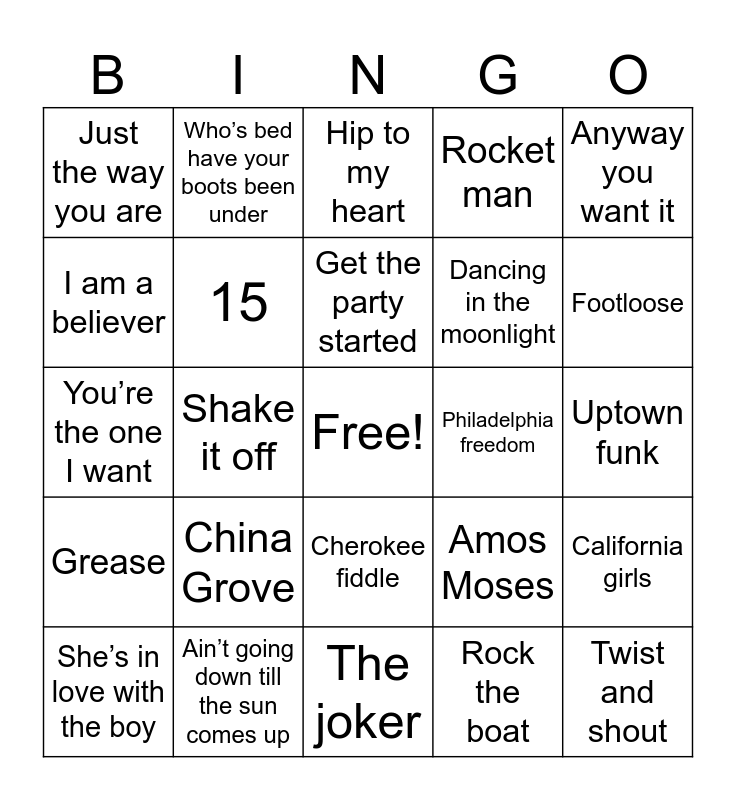 This bingo card has a free space and 73 words: Redneck girl, Crocodile rock, Hip to my heart, Amy, Oh what a night, ladies night, China Grove, Free ride, Rock the boat, Taking care of business, She’s in love with the boy, You belong with me, Philadelphia freedom, Uptown funk, Long tall Sally, Who’s bed have your boots been under, Love story, Dancing in the moonlight, September, You’re the one I want, 15, The joker, Rocket man, Twist and shout, Grease, Brick house, God bless Texas, Don’t stop believing, YMCA, Tequila, Ain’t going down till the sun comes up, I saw her standing there, Write this down, Pick up man, I am a believer, Born to be wild, Can’t buy me love, Brown eyed girl, Footloose, Heartbreaker, Saturday night fever, Cherokee fiddle, Carry-on my way word son, Watermelon crawl, Yeah, Shake it off, Get the party started, Cupid shuffle, Loving on you, Just the way you are, 5-1-5-0, Frankenstein, I like it, Nice to be with you, Long cool woman in a Black dress, Freeze Frame, I got you, Amos Moses, Heads Carolina, tails California, Pick up man, No news, Sold The Grundy County auction, Why don’t we just dance, Anyway you want it, Faithfully, Who’s crying now, Separate ways, Fireworks, California girls, Blurred lines, How sweet it is, I like it I love it and Man I feel like a woman.