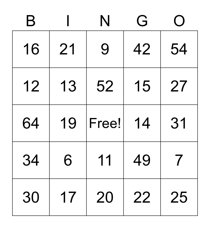 This bingo card has a free space and 24 words: 6, 17, 52, 30, 54, 16, 12, 21, 14, 11, 15, 64, 49, 7, 13, 22, 31, 9, 27, 19, 25, 34, 42 and 20.