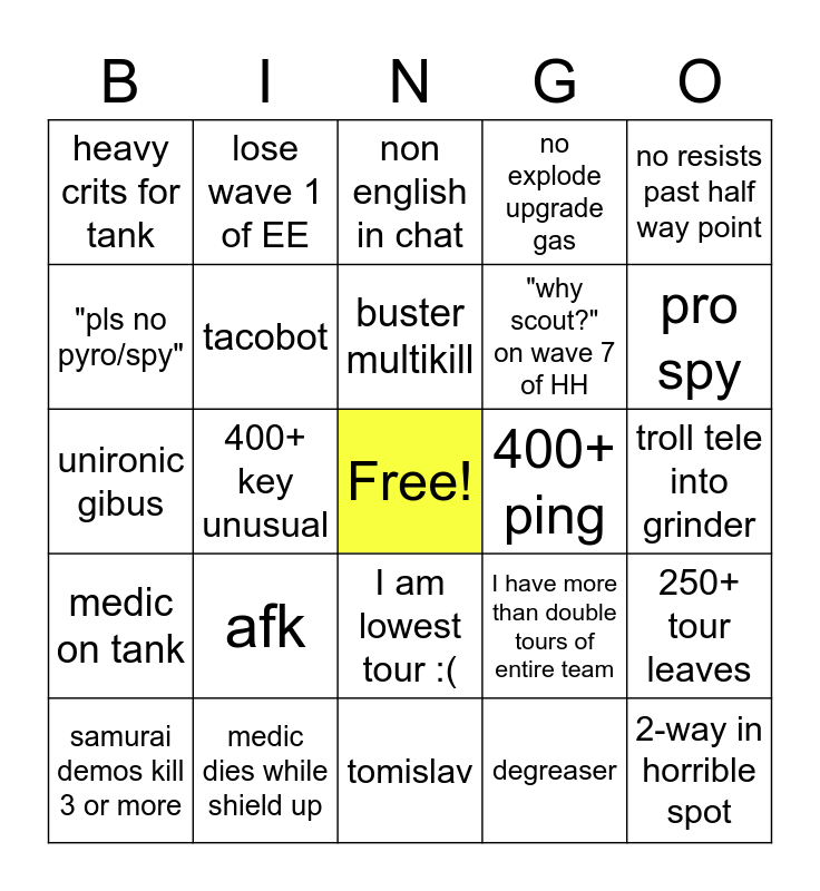 This bingo card has a free space and 50 words: stock player, 2-way in horrible spot, scout fucks up wave 1 HH, tomislav, afk, someone dies to a sentry, lose wave 1 of EE, cheater, "pls no pyro/spy", "why no medic?" on BB, tacobot, no explode upgrade gas, 250+ tour leaves, I have more than double tours of entire team, aussie/good pro ks drop, canteen before wave, buster multikill, 400+ ping, fail all med kills in a wave, no resists past half way point, 400+ key unusual, degreaser, heavy crits for tank, "why scout?" on wave 7 of HH, enemy tele, engi gets stabbed 3 times in a wave, pro spy, chad demoknight, non english in chat, I am lowest tour :(, sniper without explosive HS, jojo/among us/sfm reference, slur in username, ToS spray /avatar /objector, medic dies while shield up, hardy laurel, someone gets taunt trapped in barricade, someone dies to fall damage, huntsmen kill engi on EE wave 2, troll tele into grinder, someone dies to tank, dispenser far behind front line, swingspeed jag, someone dies to reflect, samurai demos kill 3 or more, unironic gibus, crits on backup enemies, squad surplus voucher, medic on tank and both gates capped in EE/MM.