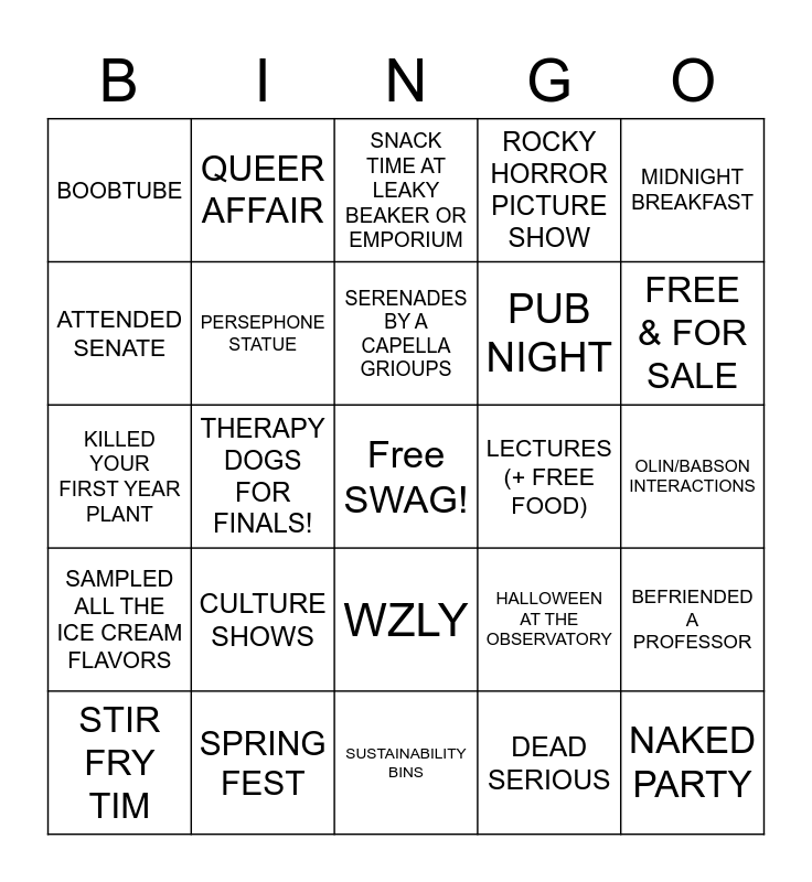 This bingo card has a free space and 55 words: TUNNELING, STIR FRY TIM, GRADUATION RACECAR FLAGS, BOOBTUBE, SUSTAINABILITY BINS, SAVAGE SWANS ON WABAN, PERSEPHONE STATUE, LEMON THAI, PUB NIGHT, REMIX, ROCKY HORROR PICTURE SHOW, SPRINTING FOR PETER PAN, SLEDDING AT SEV GREEN, FALL FRENZY, MARMON MADNESS, PRIMAL SCREAM, MIDNIGHT BREAKFAST, THERAPY DOGS FOR FINALS!, FLOWER SUNDAY, NAKED PARTY, LECTURES (+ FREE FOOD), NACHOS AT THE HOOP, HALLOWEEN AT THE OBSERVATORY, SNACK TIME AT LEAKY BEAKER OR EMPORIUM, LAST DAY OF CLASSES DECORATIONS, SERENADES BY A CAPELLA GRIOUPS, DEAD SERIOUS, HOOP ROLLING, OLIN/BABSON INTERACTIONS, BEFRIENDED A PROFESSOR, TANNER / RUHLMAN DAY!, CLIMBED TO THE TOP OF GALENSTONE TOWER, JOINED AN ORG, SANDWICH AT EL TABLE, ATTENDED SENATE, KILLED YOUR FIRST YEAR PLANT, THREW SNOWBALLS DURING WINTER STORM NEMO, SAMPLED ALL THE ICE CREAM FLAVORS, ETHOS BLACK EXCELLENCE GALA, 24 HOUR SHAKES, QUEER AFFAIR, CHEESE AND BREAD NIGHT, HOSTING A PROSPIE, STEPSINGING, CULTURE SHOWS, SPRING FEST, LIP SYNC, LAKE DAY, TRI-COOP FORMAL, FREE & FOR SALE, ATTENDING A PROTEST, TANGLED PIXEL HARPSICHORD, START YOUR STORY, WZLY and ORIENTATION LAKE DIVE.