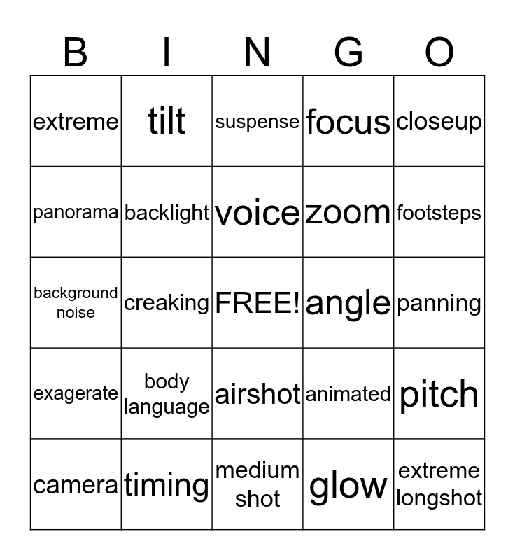 This bingo card has a free space and 24 words: body language, timing, voice, camera, closeup, extreme, panorama, tilt, angle, airshot, zoom, background noise, animated, pitch, backlight, glow, panning, suspense, footsteps, creaking, extreme longshot, exagerate, focus and medium shot.