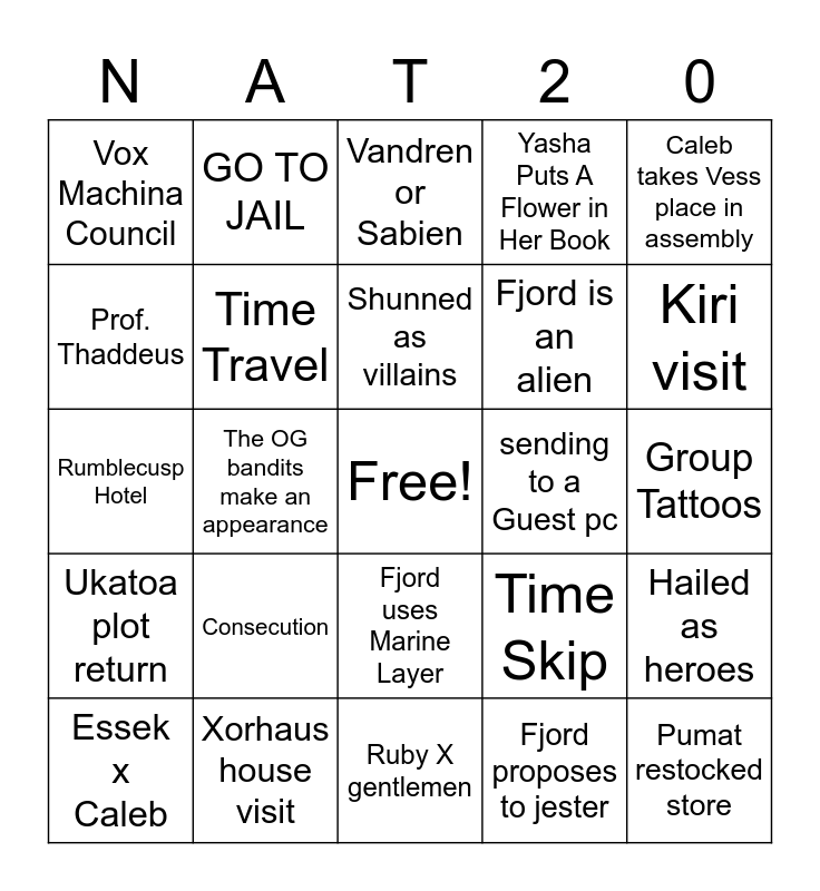 This bingo card has a free space and 29 words: Essek x Caleb, Trent Fight, The OG bandits make an appearance, Sprinkle Dies, Vox Machina Council, Vandren or Sabien, Time Travel, Consecution, sending to a Guest pc, Xorhaus house visit, Group Tattoos, Pumat restocked store, Ruby X gentlemen, Fjord proposes to jester, Kiri visit, Caleb's Memory Rooms, Fjord uses Marine Layer, Ukatoa plot return, Caleb takes Vess place in assembly, Rumblecusp Hotel, Time Skip, TPK, Fjord is an alien, Prof. Thaddeus, Yasha Puts A Flower in Her Book, GO TO JAIL, Hailed as heroes, Shunned as villains and Artagan does something bad.
