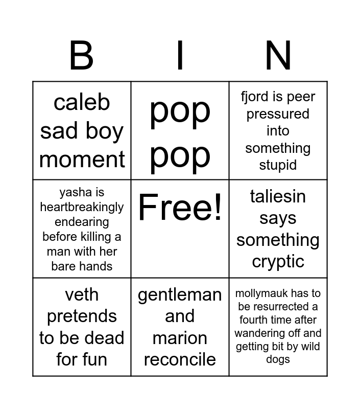 This bingo card has a free space and 8 words: taliesin says something cryptic, fjord is peer pressured into something stupid, pop pop, veth pretends to be dead for fun, caleb sad boy moment, mollymauk has to be resurrected a fourth time after wandering off and getting bit by wild dogs, yasha is heartbreakingly endearing before killing a man with her bare hands and gentleman and marion reconcile.