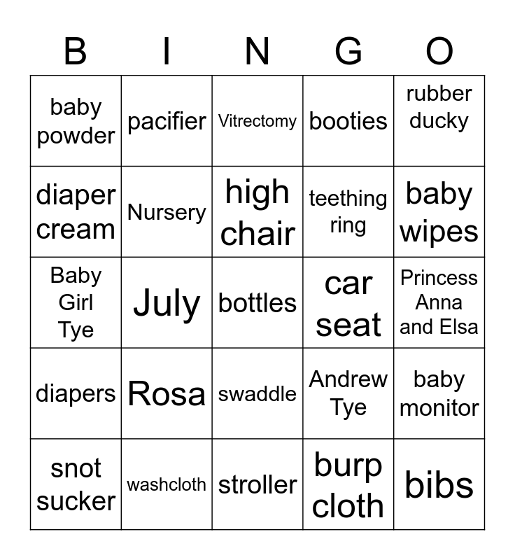 This bingo card has 25 words: Rosa, stroller, high chair, snot sucker, rubber ducky, baby powder, diaper cream, pacifier, car seat, swaddle, teething ring, Baby Girl Tye, Andrew Tye, baby monitor, Nursery, bibs, Princess Anna and Elsa, Vitrectomy, baby wipes, July, bottles, washcloth, diapers, booties and burp cloth.