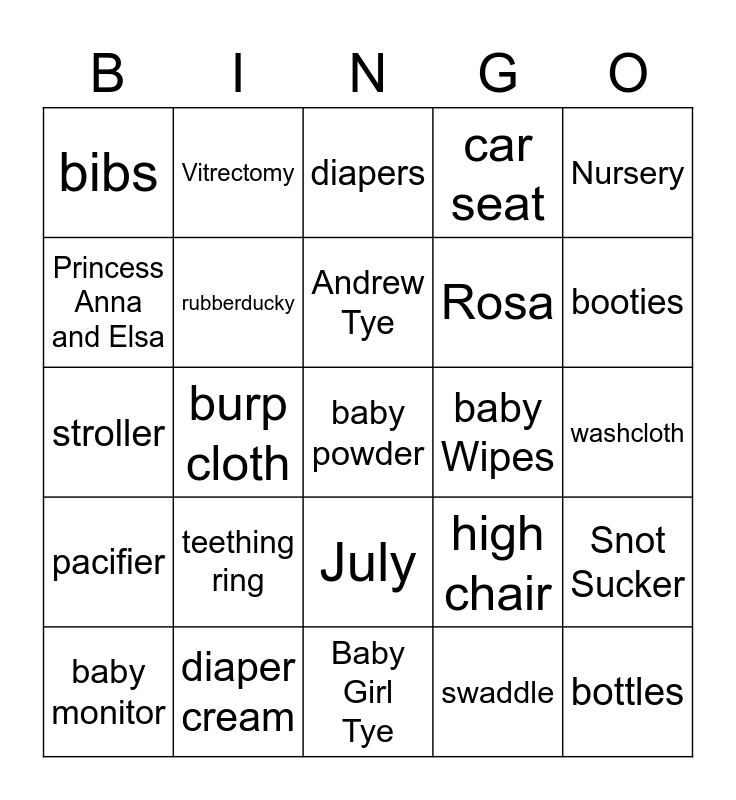 This bingo card has 25 words: teething ring, Baby Girl Tye, Andrew Tye, baby monitor, Nursery, bibs, Princess Anna and Elsa, Vitrectomy, baby Wipes, July, Rosa, stroller, high chair, Snot Sucker, rubberducky, bottles, washcloth, diapers, booties, burp cloth, baby powder, diaper cream, pacifier, car seat and swaddle.