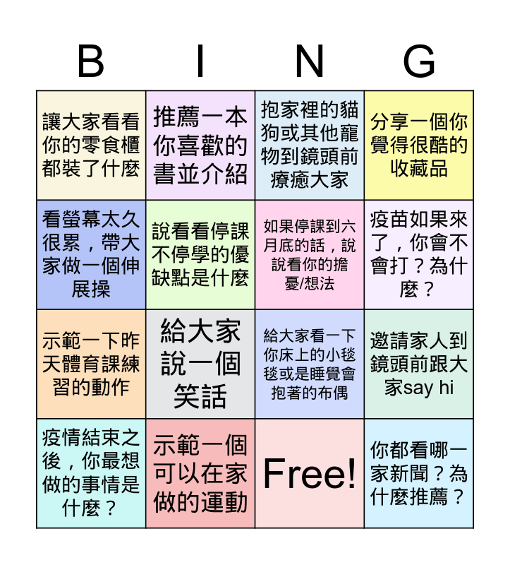 This bingo card has 16 words: 示範一個可以在家做的運動, 邀請家人到鏡頭前跟大家say hi, 抱家裡的貓狗或其他寵物到鏡頭前療癒大家, 讓大家看看你的零食櫃都裝了什麼, 示範一下昨天體育課練習的動作, 推薦一本你喜歡的書並介紹, 給大家看一下你床上的小毯毯或是睡覺會抱著的布偶, Free!, 看螢幕太久很累,帶大家做一個伸展操, 說看看停課不停學的優缺點是什麼, 疫情結束之後,你最想做的事情是什麼?, 分享一個你覺得很酷的收藏品, 給大家說一個笑話, 疫苗如果來了,你會不會打?為什麼?, 如果停課到六月底的話,說說看你的擔憂/想法 and 你都看哪一家新聞?為什麼推薦?.