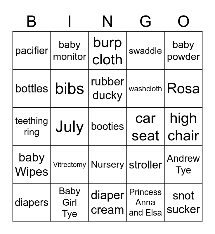 This bingo card has 25 words: Vitrectomy, diaper cream, rubber ducky, diapers, baby powder, pacifier, bottles, baby monitor, car seat, Nursery, washcloth, teething ring, stroller, Andrew Tye, bibs, snot sucker, high chair, burp cloth, Rosa, July, booties, Baby Girl Tye, baby Wipes, swaddle and Princess Anna and Elsa.