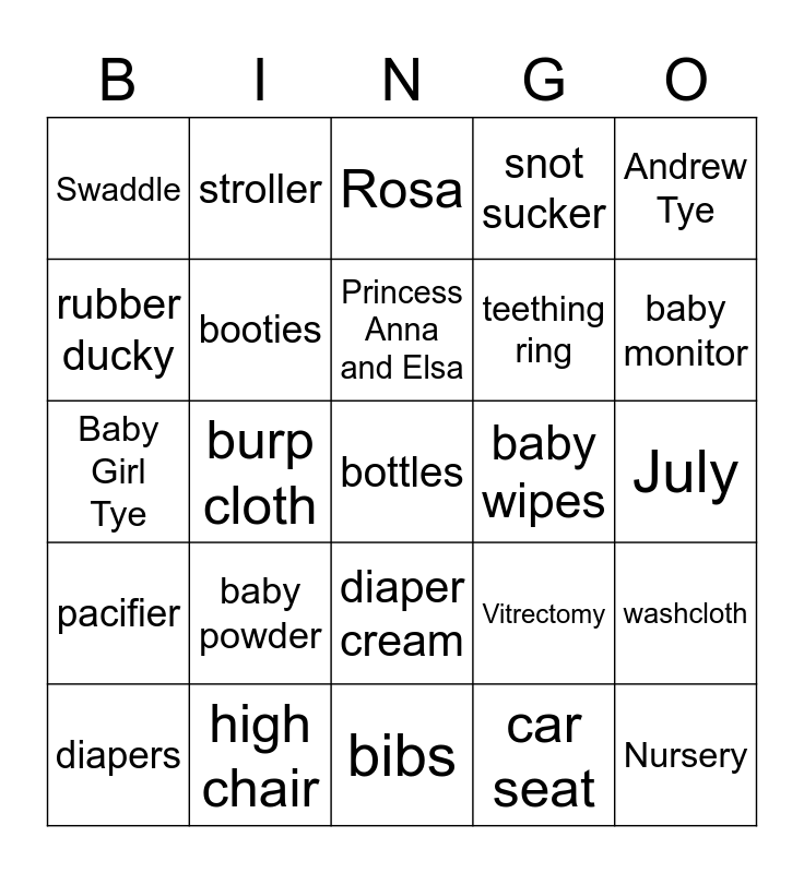 This bingo card has 25 words: baby powder, bibs, Princess Anna and Elsa, diapers, Andrew Tye, Swaddle, rubber ducky, stroller, baby wipes, diaper cream, teething ring, Baby Girl Tye, Vitrectomy, washcloth, booties, Nursery, July, Rosa, baby monitor, burp cloth, bottles, high chair, pacifier, snot sucker and car seat.