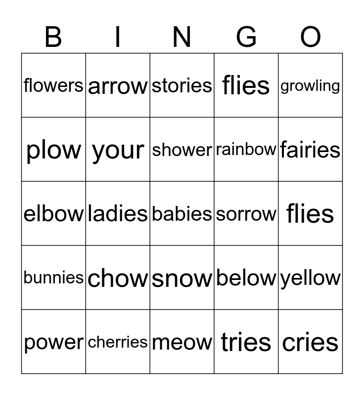 This bingo card has 25 words: chow, meow, shower, power, growling, flowers, plow, arrow, sorrow, snow, rainbow, elbow, below, yellow, your, cries, flies, stories, fairies, ladies, babies, cherries, bunnies, flies and tries.