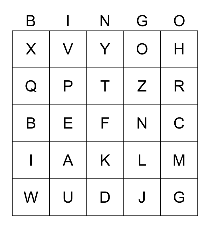 This bingo card has 25 words: A, D, T, W, H, X, Q, V, N, K, Z, B, L, M, P, G, C, Y, R, E, F, U, I, O and J.