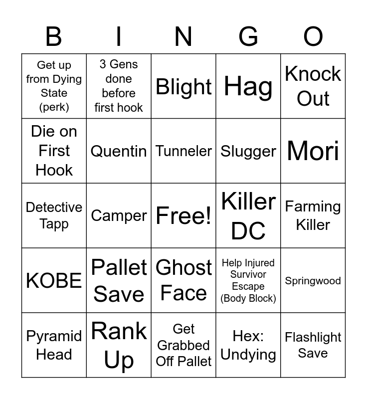 This bingo card has a free space and 114 words: Trapper, Wraith, Hillbilly, Nurse, Myers, Dancing Myers, Hag, Doctor, Huntress, Bubba (Cannibal), Freddy, Pig, Clown, Spirit, Legion, Vommy Mommy (Plague), Ghost Face, Demogorgon, Oni, Deathslinger, Pyramid Head, Blight, Twins, Trickster, Boop of the Pig Snoot, KOBE, Rank Up, De-Rank, 4K, Hatch Escape, Mori, Tunneler, Camper, No Hooked Game, Insta Down, Hex: NOED, Hex: RUIN, Thanatophobia, Hex: Haunted Ground, Hex: Devour Hope, Hex: Blood Favour, Hex: Crowd Control, Hex: Huntress Lullaby, Hex: Retribution, Hex: Third Seal, Hex: Thrill of the Hunt, Hex: Undying, Die on First Hook, Stealth Killer, Skill Check Miss, Survivor DC, Killer DC, Macmillan Estate, Autohaven Wreckers, Coldwind Farm, Crotus Penn Asylum, Haddonfield, Backwater Swamp, Lery's Memorial Institute, Red Forest, Springwood, Gideon Meat Plant, Yamaoka Estate, Ormond, Hawkins Lab, Grave of Glendale, Silent Hill, Quentin, Detective Tapp, Toxic end game chat, Farming Killer, Hit a Trap (Hag/Trapper), Spawn in Killer Shack, Spawn near Hex Totem, Spawn all together, Flashlight Save, Pallet Save, Get up from Dying State (perk), Exposed by Stalker (Myers/Ghostface), A TTV Player, Sandbagged, 3 Gens done before first hook, 3 Gen’er, Help Injured Survivor Escape (Body Block), Slugger, AFK Killer, AFK Survivor, Ghastly Gataeu, Game Crashes, Double Map Offering, Killer hits Survivor on Hook, Scoops Steve, Franklin Demise, Knock Out, Missed skill check, Great skill check, Amanda Screams, Teammate points to go do something, Shirtless david, Key escape, No Gens done, D-Strike, Match Cancelled (DC before game start), Teammate found In locker, Found in locker, Looper, Get Grabbed Off Gen, Get Grabbed Off Pallet, Get Grabbed Off Unhook, Escape without being hooked (Does not work for AFK), Complete a Rift Challenge, Amanda remembers to burn an offering, Ashley’s hand puppet and Amanda starts singing.