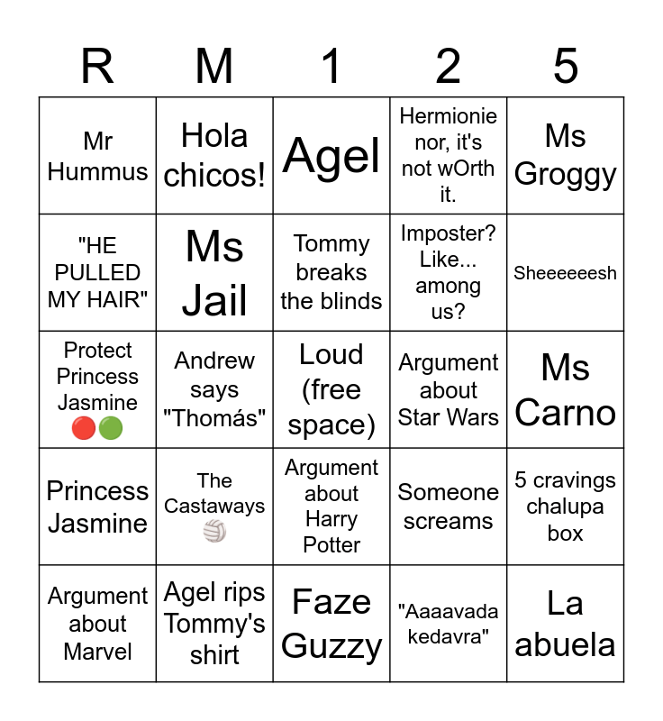 This bingo card has a free space and 29 words: Argument about Marvel, Buckets, Andrew says "Thomás", Mom, Mr Hummus, Agel, Ms Jail, The Castaways 🏐, Argument about Star Wars, Agel rips Tommy's shirt, Ms Carno, La abuela, Faze Guzzy, "Aaaavada kedavra", Sheeeeeesh, Travvy patty, Argument about Harry Potter, Princess Jasmine, Ms Groggy, Protect Princess Jasmine 🔴🟢, Someone screams, Ms Dirt Apartment, Imposter? Like... among us?, "HE PULLED MY HAIR", Hermionie nor, it's not wOrth it., Hola chicos!, 5 cravings chalupa box, Tommy breaks the blinds and Gavin's Voldemort laugh.