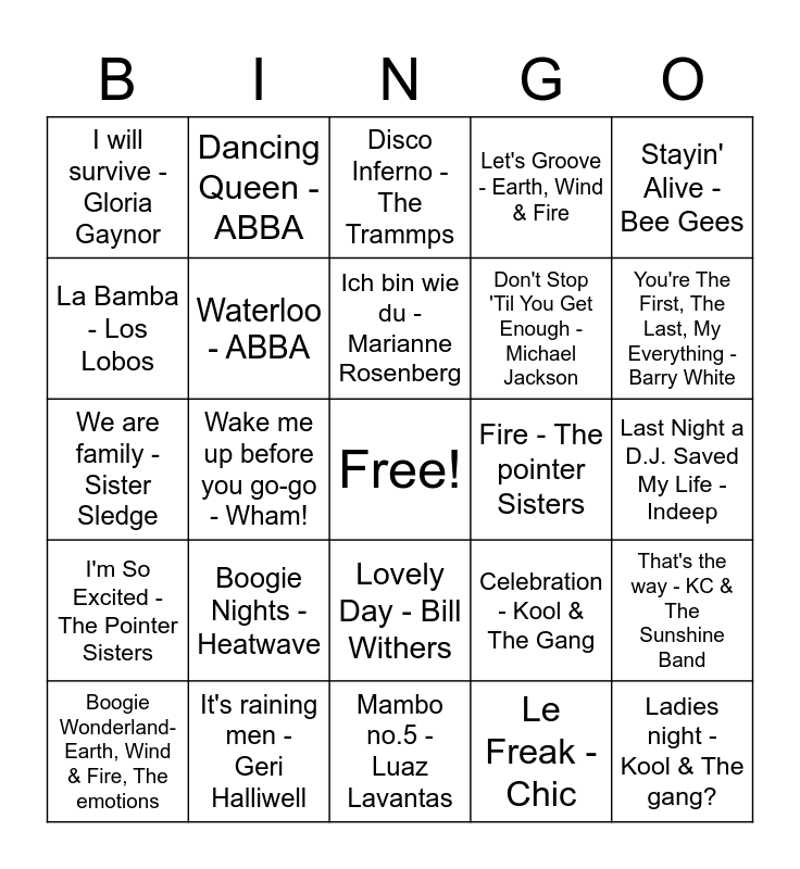 This bingo card has a free space and 43 words: Car Wash - Rose Royce, Ladies night - Kool & The gang?, The Rhythm of the night - Corona, Boogie Wonderland- Earth, Wind & Fire, The emotions, Shake your Body - The Jacksons, Le Freak - Chic, Disco Inferno - The Trammps, Crying at the discotheque - Alcatraz, Stayin' Alive - Bee Gees, It's raining men - Geri Halliwell, Let's Groove - Earth, Wind & Fire, Fire - The pointer Sisters, Lovely Day - Bill Withers, Boogie Nights - Heatwave, Never gonna give you up - Mac Beez, Mambo no.5 - Luaz Lavantas, Blame it on the boogie - The Jacksons, We are family - Sister Sledge, Can you feel it - The Jacksons, You're The First, The Last, My Everything - Barry White, Dancing Queen - ABBA, Gimme! Gimme! Gimme! - Abba, Hot Stuf - Donna Summer, I will survive - Gloria Gaynor, YMCA - Village People, Last Night a D.J. Saved My Life - Indeep, I feel love - Donna Summer, Feels like I'm in love - Kelly Marie, Celebration - Kool & The Gang, I'm So Excited - The Pointer Sisters, Night Fever - Bee Gees, That's the way - KC & The Sunshine Band, Daddy cool - Boney M., Wake me up before you go-go - Wham!, Born to be alive - Patrick Hernandez, Sexbomb - Tom Jones, Mousse T., Conga! - Miami Sound Machine, Ich bin wie du - Marianne Rosenberg, La Bamba - Los Lobos, Don't Stop 'Til You Get Enough - Michael Jackson, I'm Coming Out - Diana Ross, Waterloo - ABBA and Rock the Boat - Hues Corporation.