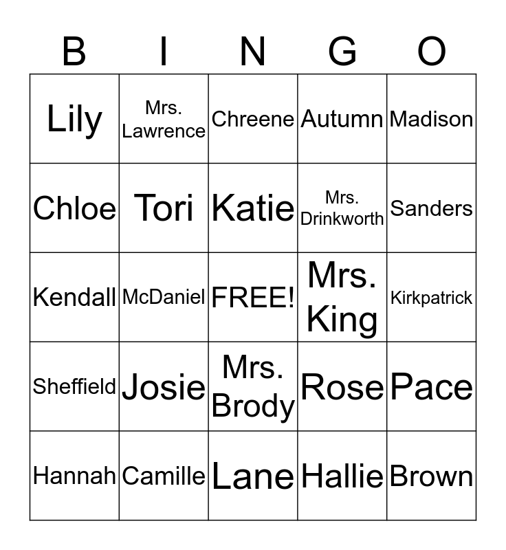 This bingo card has a free space and 24 words: Josie, Camille, Katie, Hannah, Madison, Lily, Chloe, Mrs. Lawrence, Mrs. King, Mrs. Brody, Mrs. Drinkworth, Kendall, Rose, Pace, Tori, Hallie, Kirkpatrick, Chreene, Sanders, McDaniel, Brown, Sheffield, Autumn and Lane.