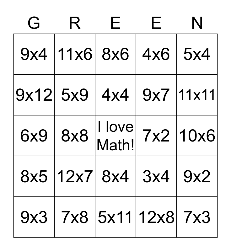This bingo card has a free space and 24 words: 12x7, 7x8, 4x4, 9x3, 5x4, 9x4, 9x12, 11x6, 7x2, 8x4, 9x7, 6x9, 3x4, 9x2, 5x9, 12x8, 10x6, 8x6, 11x11, 8x8, 7x3, 8x5, 4x6 and 5x11.