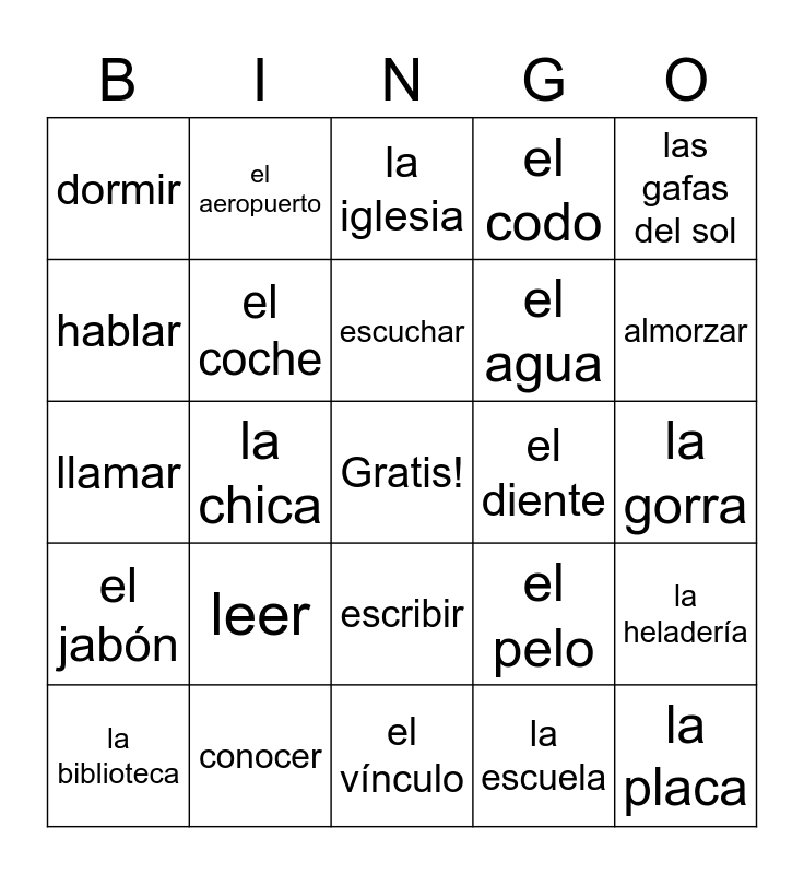 This bingo card has a free space and 44 words: la tecnología, la placa, la oreja, la biblioteca, el estómago, la escuela, la iglesia, nombre, las gafas del sol, conocer, el codo, el diente, escribir, leer, la oficina de correos, el vínculo, la panadería, llamar, pintar, almorzar, el aeropuerto, cepillarse, el libro, dormir, la ecología, la gorra, el/la doctor, el desayuno, el pelo, el jabón, la comida, la heladería, el apartamento, el césped, la chica, el chico, tener, hacer, escuchar, hablar, el agua, trabajar, el coche and amigo/a.