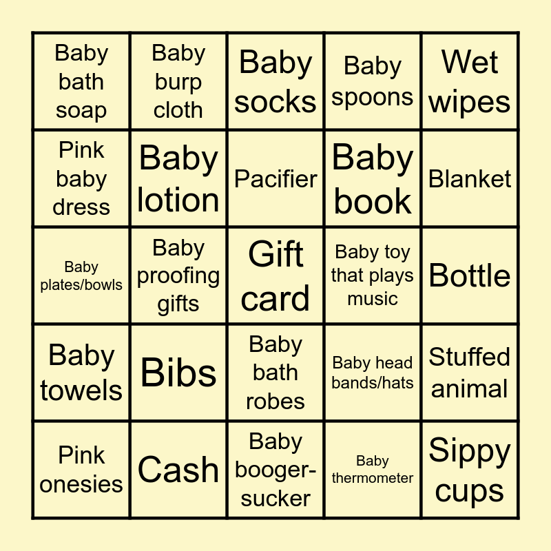 This bingo card has 25 words: Bibs, Baby booger-sucker, Pacifier, Pink onesies, Wet wipes, Baby bath soap, Pink baby dress, Baby burp cloth, Baby toy that plays music, Baby bath robes, Baby book, Baby plates/bowls, Baby head bands/hats, Stuffed animal, Baby lotion, Sippy cups, Bottle, Baby socks, Blanket, Baby proofing gifts, Gift card, Cash, Baby towels, Baby spoons and Baby thermometer.