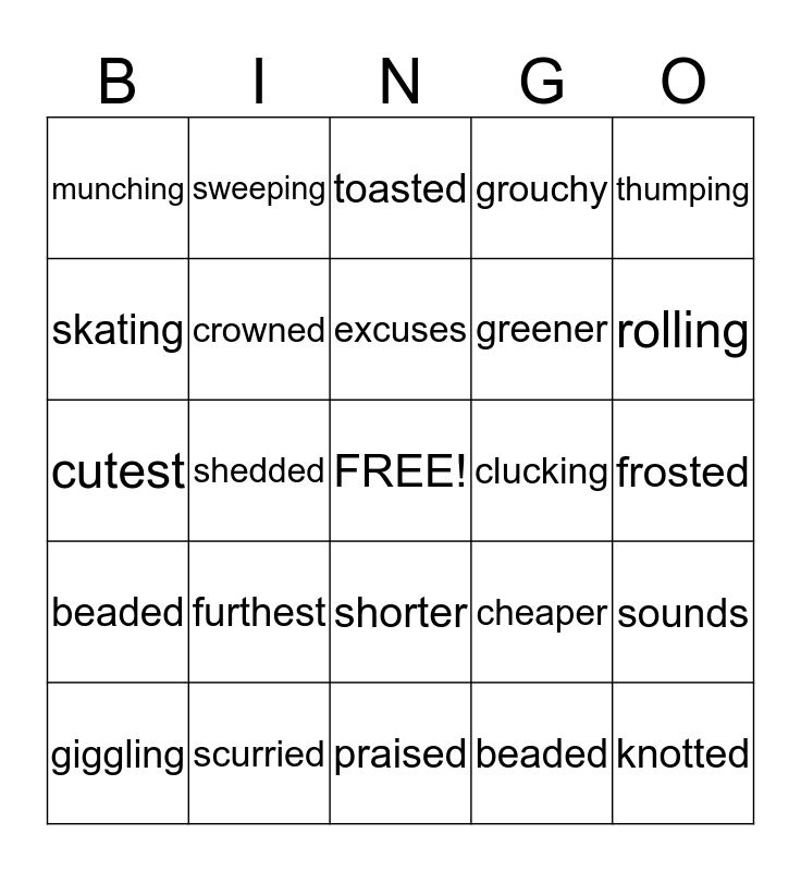 This bingo card has a free space and 24 words: furthest, scurried, excuses, giggling, thumping, munching, skating, sweeping, clucking, shorter, greener, cutest, cheaper, sounds, crowned, beaded, frosted, toasted, rolling, shedded, knotted, beaded, grouchy and praised.