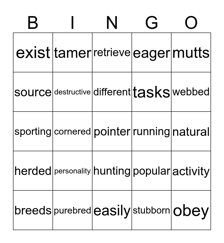 This bingo card has a free space and 24 words: personality, purebred, different, breeds, mutts, exist, source, tamer, running, hunting, tasks, sporting, popular, activity, destructive, stubborn, natural, retrieve, webbed, cornered, obey, herded, eager and easily.