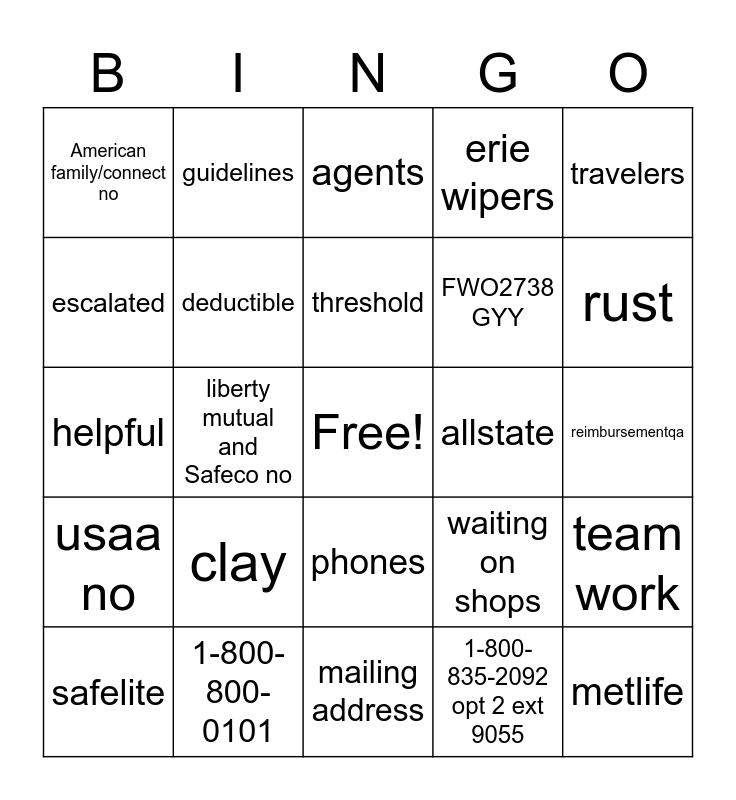 This bingo card has a free space and 39 words: no coverage, free windshield, ky, sc, fl, deductible, safelite, phones, threshold, nationwide, travelers, usaa no, liberty mutual and Safeco no, erie wipers, metlife, reimbursementqa, allstate, clay, progressive, American family/connect no, coverage verification, waiting on shops, escalated, mailing address, FWO2738 GYY, rust, body damage, ctu, grange 9055, teams chat, vin number, guidelines, reimbursement policies, insured, agents, 1-800-800-0101, 1-800-835-2092 opt 2 ext 9055, awesome team, team work, helpful and makes people happy.