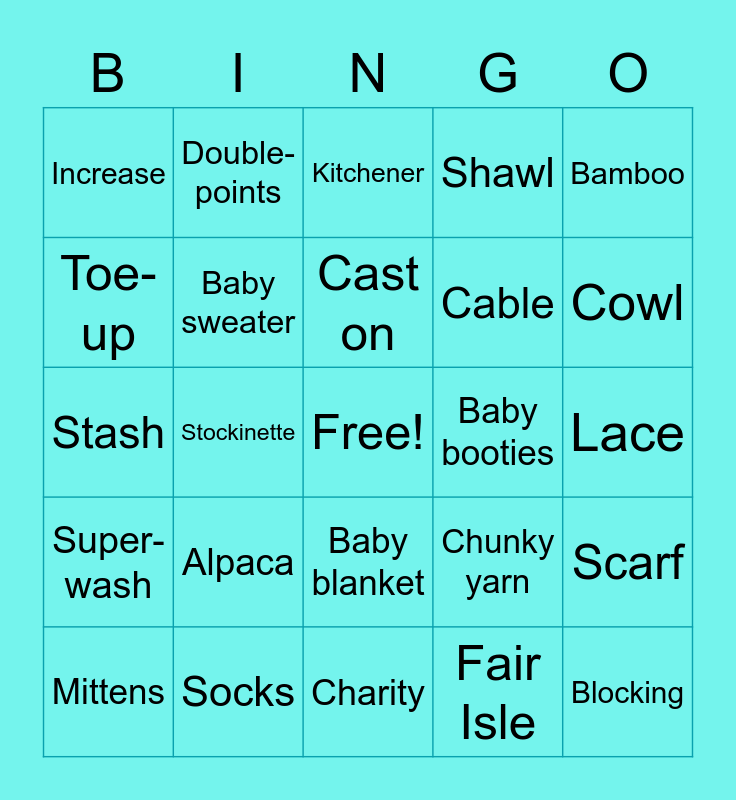 This bingo card has a free space and 30 words: Socks, Garter, Stockinette, Decrease, Increase, Kitchener, Baby sweater, Baby blanket, Baby booties, Charity, Lace, Blocking, Fair Isle, Hat, Cowl, Sweater, Chunky yarn, Super-wash, Alpaca, Bamboo, Stash, Bind off, Double-points, Cable, Toe-up, Shawl, Scarf, Mittens, Cast on and Top down.