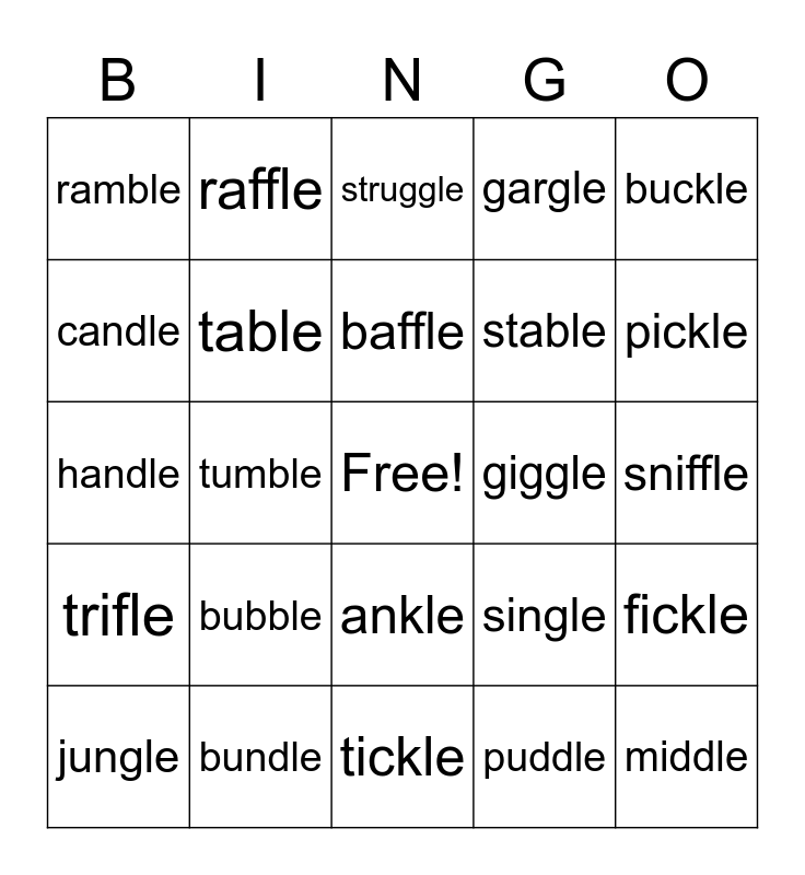 This bingo card has a free space and 24 words: bubble, bundle, baffle, jungle, buckle, ramble, candle, raffle, giggle, ankle, stable, handle, single, fickle, table, puddle, sniffle, struggle, pickle, tumble, middle, trifle, gargle and tickle.