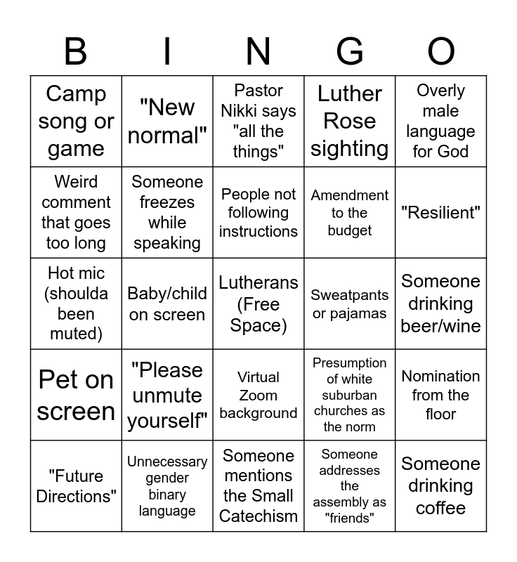 This bingo card has a free space and 40 words: Fiber crafts on screen, Hot mic (shoulda been muted), Audio problems, Someone freezes while speaking, Unnecessary gender binary language, Virtual Zoom background, People not following instructions, Consulting the parliamentarian, Overly male language for God, Pet on screen, Baby/child on screen, Luther Rose sighting, Someone drinking coffee, Someone drinking beer/wine, Sweatpants or pajamas, "Please unmute yourself", Reference to Israel/Palestine, Camp song or game, Pastor Nikki can be heard laughing off-screen, Pastor Nikki says "all the things", Nomination from the floor, Someone addresses the assembly as "friends", Amendment to the budget, Weird comment that goes too long, Anxiety about money, "Unprecedented times", Person over 50 who knows what young people want from church, Invitation to stretch, Invitation to dance, Video greetings, Someone gives a shoutout to their pastor or congregation, "Future Directions", "Vitality", Presumption of white suburban churches as the norm, "Resilient", Someone mentions the Small Catechism, Hamilton quote, Bonhoeffer quote, "New normal" and ASL interpreter is more interesting than the speaker.