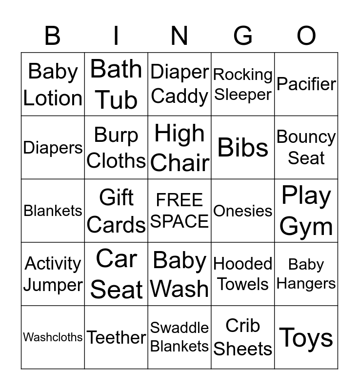This bingo card has a free space and 24 words: Car Seat, Teether, High Chair, Washcloths, Pacifier, Baby Lotion, Diapers, Bath Tub, Onesies, Baby Wash, Bibs, Blankets, Hooded Towels, Baby Hangers, Burp Cloths, Crib Sheets, Play Gym, Diaper Caddy, Bouncy Seat, Gift Cards, Toys, Activity Jumper, Rocking Sleeper and Swaddle Blankets.
