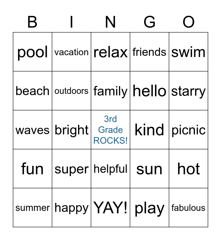 This bingo card has a free space and 24 words: super, happy, family, summer, swim, pool, beach, vacation, kind, helpful, hello, waves, sun, hot, outdoors, play, picnic, relax, starry, bright, fabulous, fun, friends and YAY!.